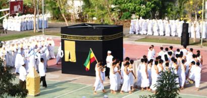 Mahasiswa terlihat begitu antusias melakukan berbagai ritual haji maupun umrah. Mulai dari pakaian yang menyerupai ihram hingga semua bacaan serta kegiatan yang berkenaan dengan ibadah haji mereka praktek kan secara bersama-sama. Menurut Ketua Panitia manasik haji tahun ini Ustad Aunul Hakim mengatakan bahwa manasik haji tahun ini lebih ramai dari tahun sebelumnya, seluruh mahasiswa antusias mengikuti berbagai agenda termasuk juga mahasiswa asing. “Ini rangkaian dari kegiatan yang ada di Ma’had Sunan Ampel Al-Aly, selain mengkaji ilmu melalui al-Qur’an dan Hadist, kita juga mempraktekkannya guna menjadi media pembelajaran yang nyata bagi mahasiswa baru yang tinggal di Ma’had”, terang bapak yang merupakan pengasuh Ma’had itu. Semoga melalui kegiatan yang diikuti 3200 lebih mahasiswa baru ini dapat dimanfaatkan oleh mahasiswa untuk belajar secara langsung tentang ibadah haji. Sambung Aunul Hakim yang juga merupakan Dosen Bahasa Arab di Fakultas Humaniora. (dcp/qin)